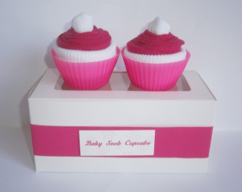 Delight the new parents with this cute box of cupcakes for a cute baby. Our cupcakes are made from baby socks snuggled in a silicone cupcake case.
